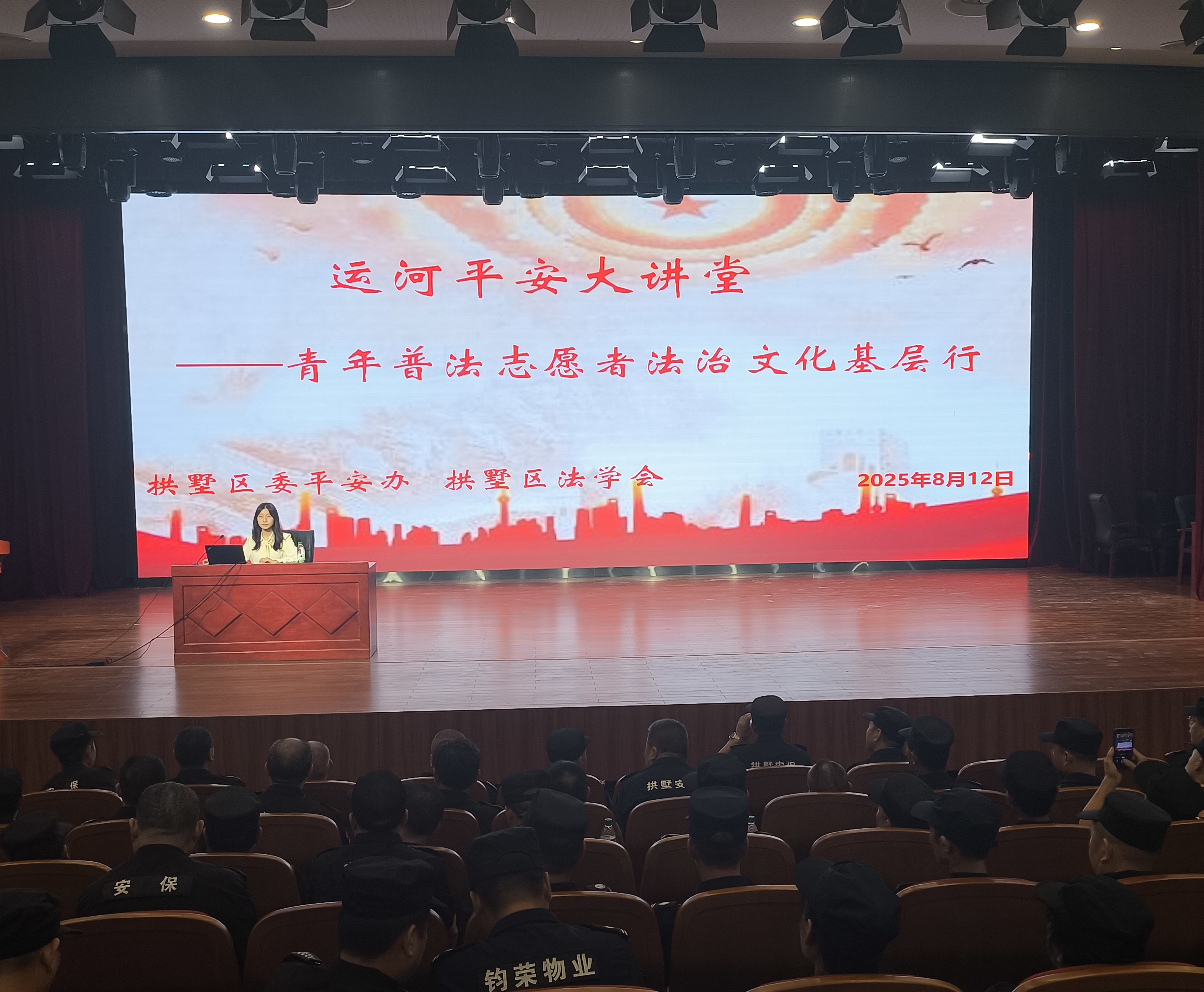 8月11日至12日,拱墅区平安办联合区教育局、区公安分局、杭州拱墅安保服务集团有限公司等部门开展区教育系统保安人员业务技能培训活动,拱墅区法学会组织青年普法志愿者为参加培训的安保人员进行了法治宣讲。