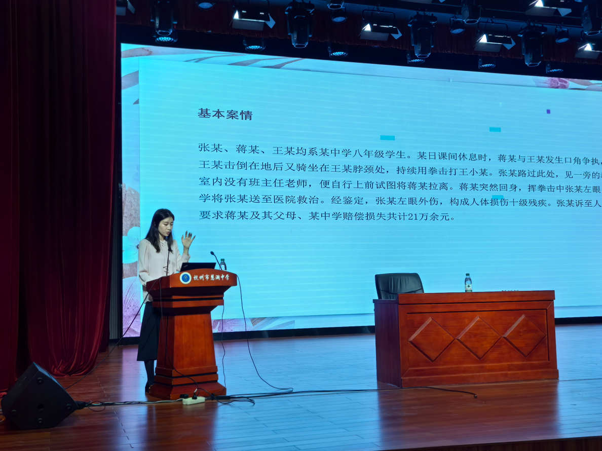 在杭州市慧澜中学,青年普法志愿者黄文柬律师从校园安全民事纠纷典型案例分享,以及维护校园安全可具体实施的安保措施等方面为切入点,深入讲解校园安全管理法律问题,有效提升了保安的法律意识与依法处理问题的能力。